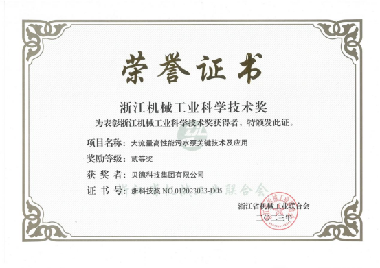 2023年12月,浙江省機械工業(yè)聯(lián)合會發(fā)布了《關(guān)于表彰2023年度浙江機械工業(yè)科學(xué)技術(shù)獎獎勵項目的決定》,表彰在機械工業(yè)科技工作中作出突出貢獻的單位和人員,共112個項目獲獎,其中一等獎14項、二等獎28項、三等獎70項,貝德科技集團有限公司憑借“大流量高性能污水泵關(guān)鍵技術(shù)及應(yīng)用”項目榮獲二等獎!